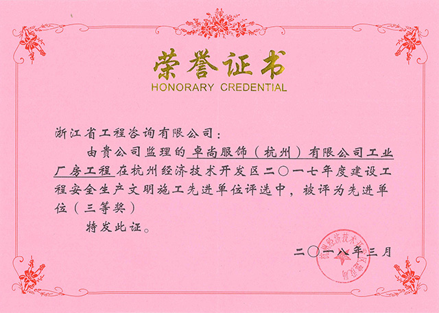 2017年度建設工程安全生產(chǎn)文明施工先進單位-卓尚服飾(杭州)有限公司工業(yè)廠房工程