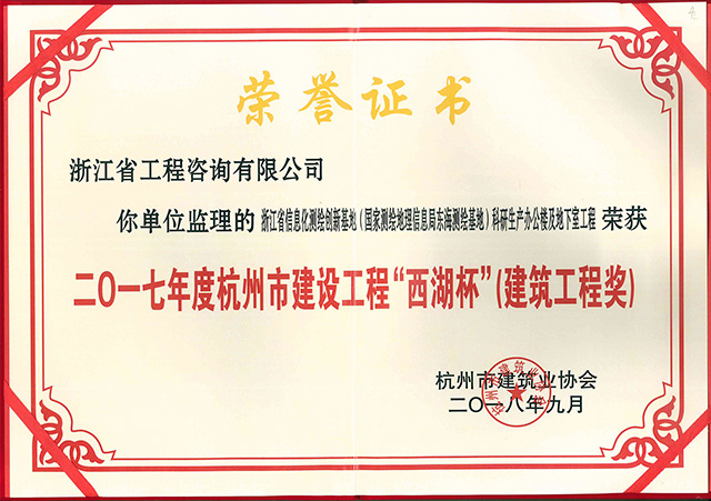 2017年度杭州市建設工程“西湖杯”(建筑工程獎)-浙江省信息化測繪創(chuàng)新基地(國家測繪地理信息局東海測繪基地)科研生產(chǎn)辦公樓及地下室工程