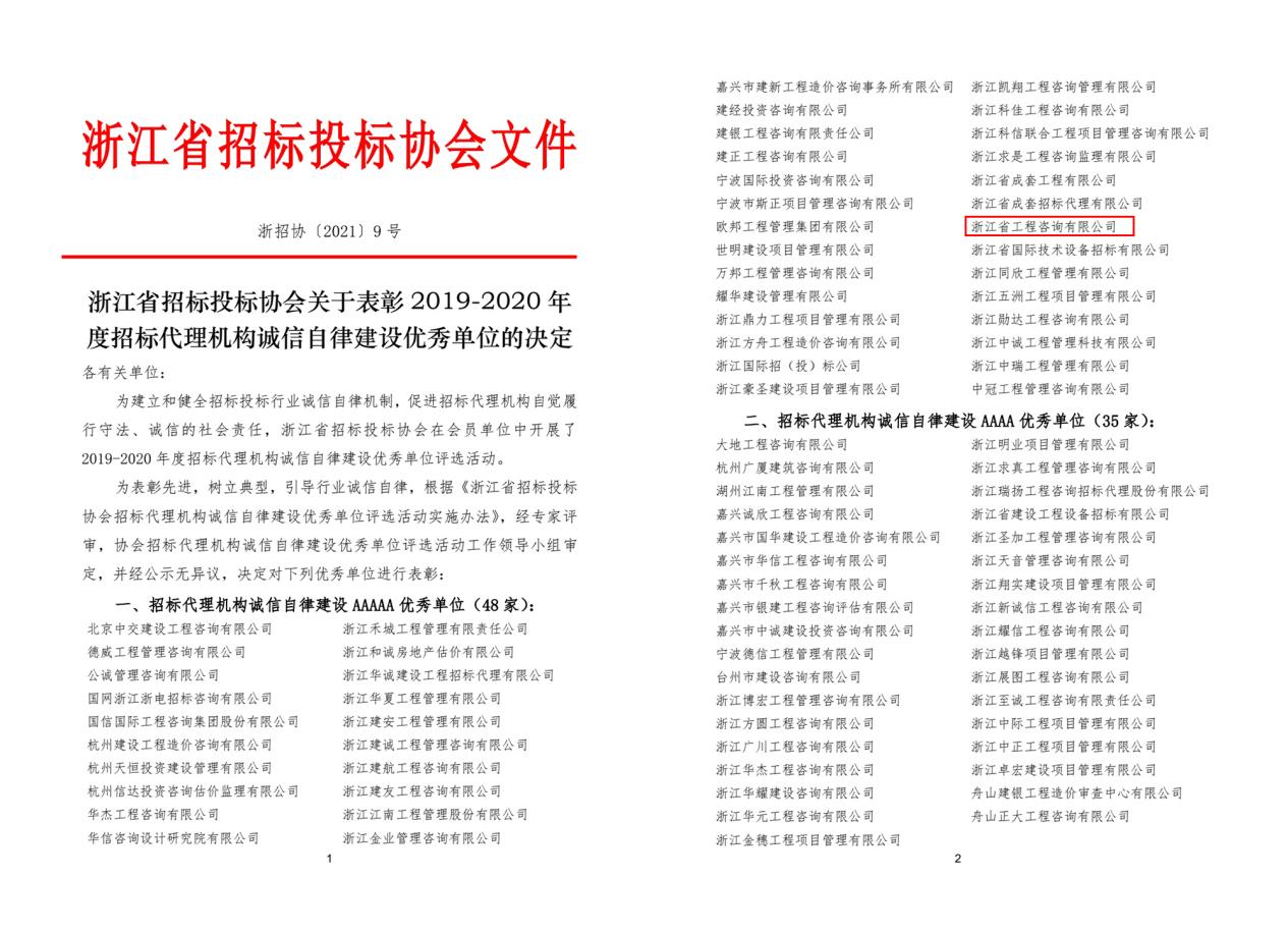 近日,根據(jù)《浙江省招標(biāo)投標(biāo)協(xié)會(huì)招標(biāo)代理機(jī)構(gòu)誠(chéng)信自律建設(shè)優(yōu)秀單位評(píng)選活動(dòng)實(shí)施辦法》,經(jīng)專家評(píng)審,協(xié)會(huì)招標(biāo)代理機(jī)構(gòu)誠(chéng)信自律建設(shè)優(yōu)秀單位評(píng)選活動(dòng)工作領(lǐng)導(dǎo)小組審定,我公司被評(píng)為2019-2020年度招標(biāo)代理機(jī)構(gòu)誠(chéng)信自律建設(shè)AAAAA優(yōu)秀單位。公司已連續(xù)多年獲得招標(biāo)代理機(jī)構(gòu)誠(chéng)信自律建設(shè)AAAAA優(yōu)秀單位。