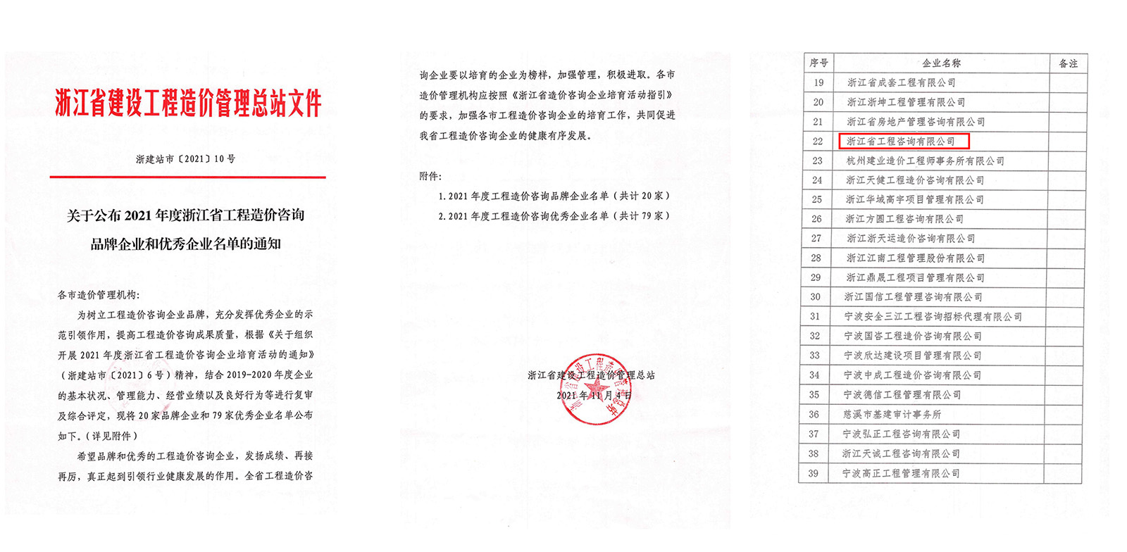 近日,浙江省建設工程造價管理總站根據《關于組織開展2021年度浙江省工程造價咨詢企業(yè)培育活動的通知》(浙建站市〔2021〕6號)精神,結合2019-2020年度企業(yè)的基本狀況、管理能力、經營業(yè)績以及良好行為等進行復審及綜合評定,評選出20家品牌企業(yè)和79家優(yōu)秀企業(yè),我公司憑借優(yōu)異的表現,再次獲得“浙江省工程造價咨詢優(yōu)秀企業(yè)”榮譽稱號。