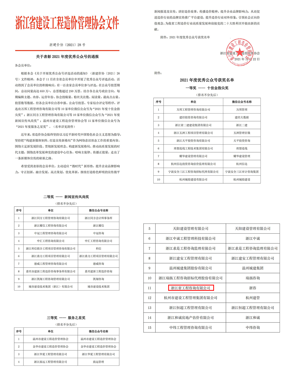根據(jù)《關(guān)于開展優(yōu)秀公眾號評選活動的通知》(浙建價協(xié)〔2021〕26號)文件精神,浙江省建設(shè)工程造價管理協(xié)會于2021年11月在全省會員單位中開展了優(yōu)秀公眾號評選活動,有一百余家會員單位參與評選。我公司通過自薦申報、公眾號投票、專家綜合評定等程序,結(jié)合單位公眾號的政治方向、每期編輯主題、內(nèi)容、運營年份、協(xié)會投稿量、粉絲關(guān)注數(shù)、閱讀量、最高點擊量、投票數(shù)等數(shù)據(jù),最終榮獲“2021年度服務(wù)之星獎”。