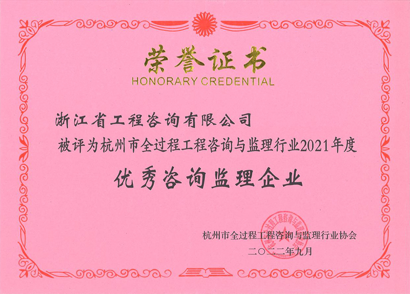 近日,根據(jù)杭州市全過程工程咨詢與監(jiān)理行業(yè)協(xié)會六屆二次理事會決議精神和杭咨監(jiān)協(xié)(2022)7號文件,杭州市全過程工程咨詢與監(jiān)理行業(yè)協(xié)會組織開展了杭州市咨詢監(jiān)理行業(yè)2021年度優(yōu)秀(先進)集體和個人選樹活動。經(jīng)協(xié)會秘書處初審,選樹活動評審委員會評審,我公司被評為杭州市全過程工程咨詢與監(jiān)理行業(yè)2021年度優(yōu)秀咨詢監(jiān)理企業(yè)。