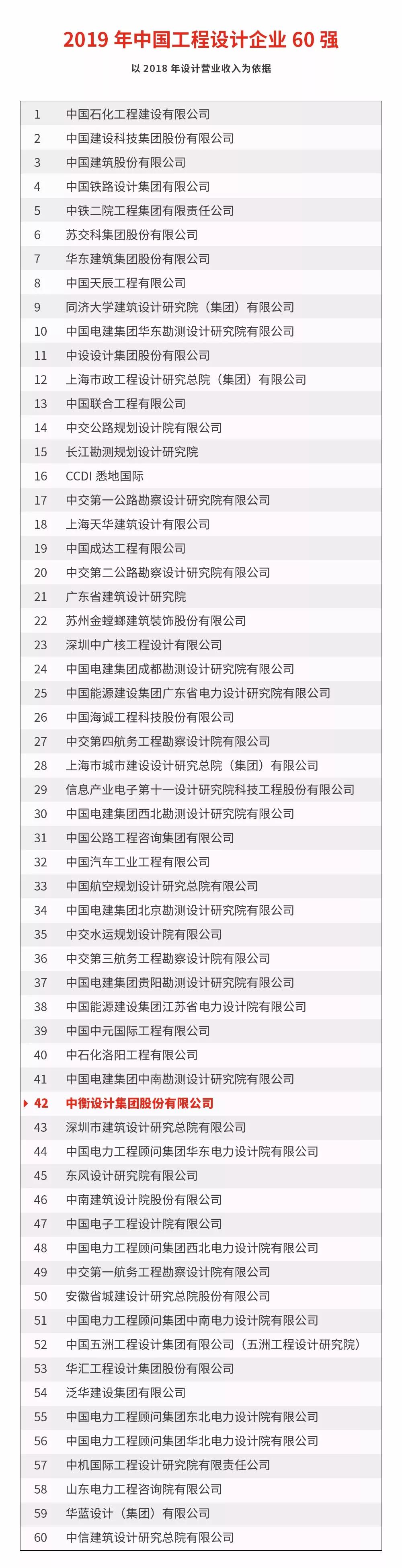 2019中國工程設(shè)計(jì)企業(yè)60強(qiáng)以包括石化、交通、電力、建筑等各大行業(yè)設(shè)計(jì)企業(yè)2018年設(shè)計(jì)營業(yè)收入為統(tǒng)計(jì)依據(jù)(不包含總承包的工程施工收入)。中衡設(shè)計(jì)此次躋身全行業(yè)第42位,排名較之2018年的51位有較大提升(2018年排名詳見文末“相關(guān)閱讀”),展現(xiàn)了集團(tuán)積極應(yīng)對國內(nèi)外經(jīng)濟(jì)和設(shè)計(jì)行業(yè)新形勢,充分利用公司集團(tuán)化運(yùn)作和區(qū)域布局的優(yōu)勢,以市場需求為導(dǎo)向,以設(shè)計(jì)為核心,持續(xù)不斷地推進(jìn)技術(shù)創(chuàng)新,強(qiáng)化公司核心競爭力,繼續(xù)保持健康、穩(wěn)定的良好均衡發(fā)展態(tài)勢。
