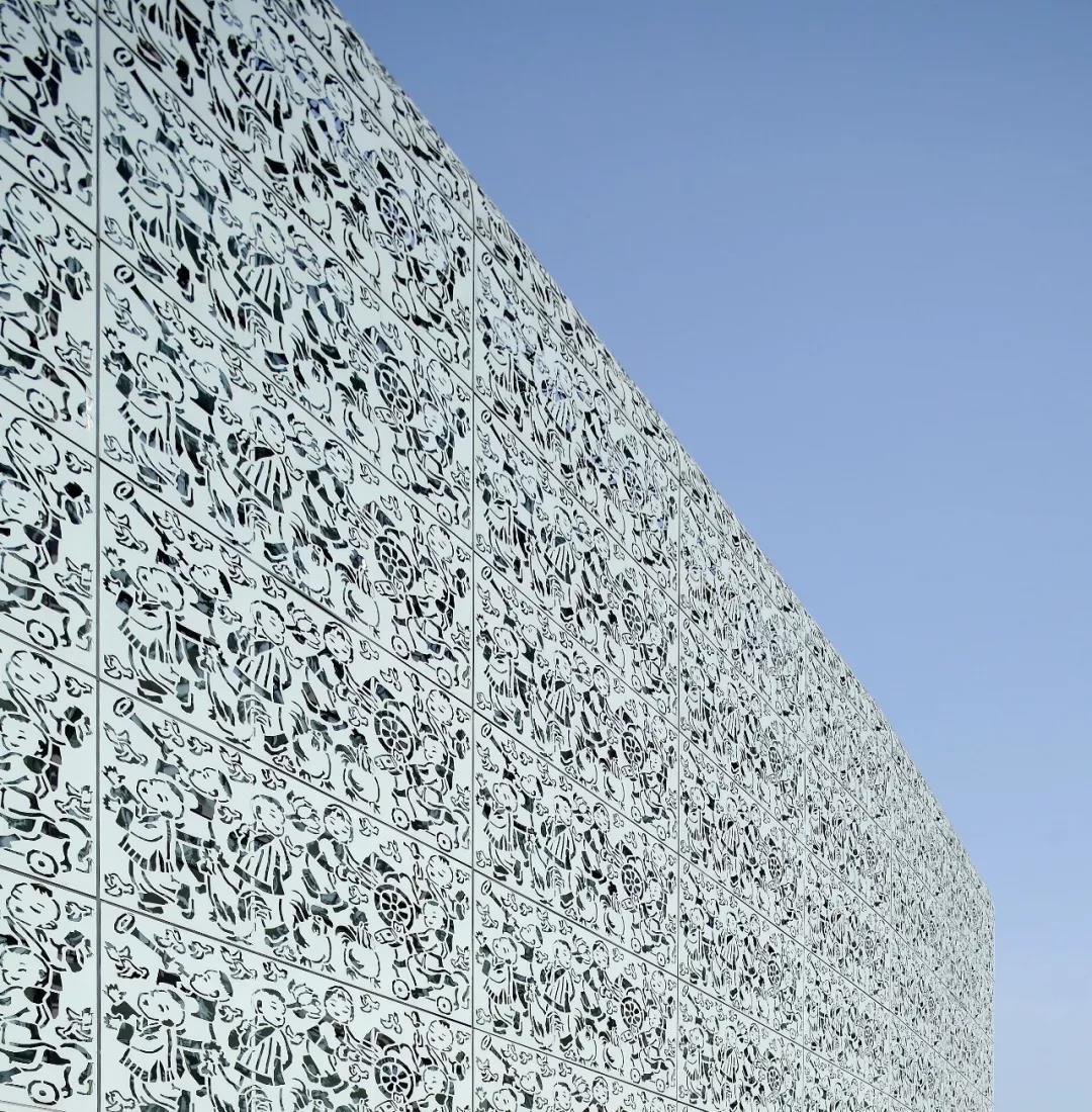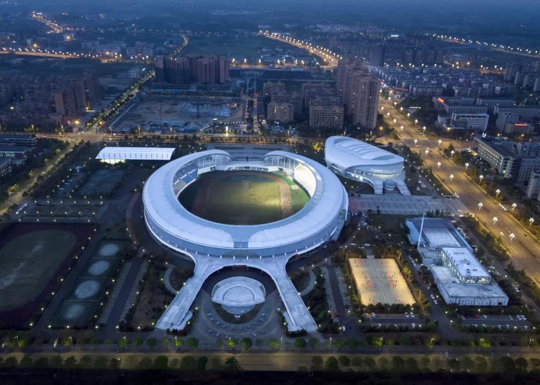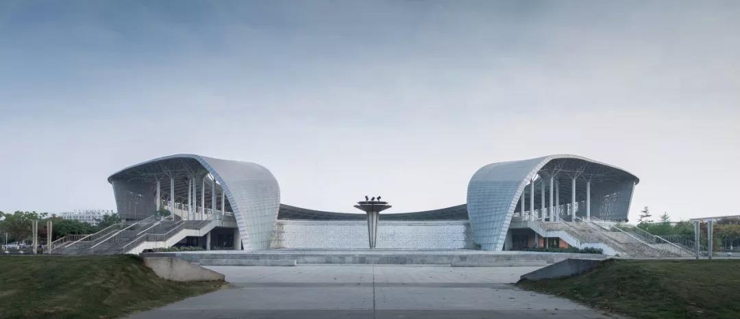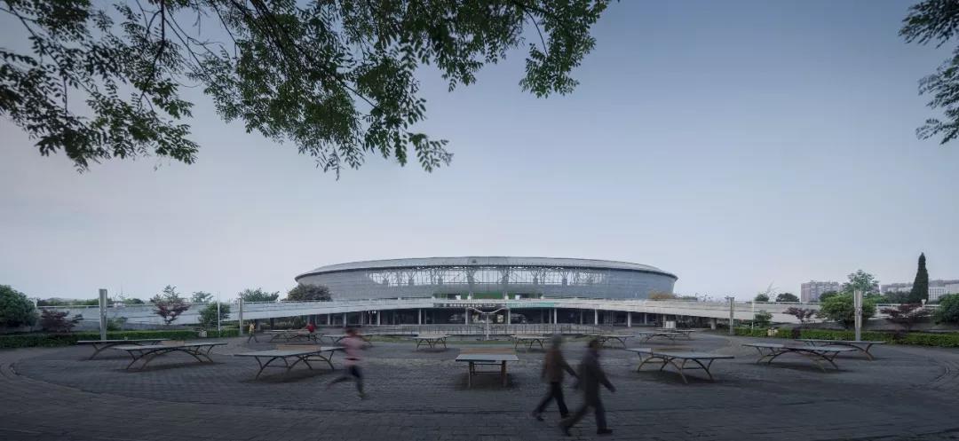 綿竹體育中心利用原未實施完成的舊體育場改造建設,原場地曾在2008年地震中臨時存放罹難者遺體,新設計的主旨便被定義為“紀念”與“希望”。主體育場屋面既以雙臂“環(huán)抱”的姿態(tài)守護對逝者的記憶,又以“舞動”的姿態(tài)激勵生者的勇氣。建筑北向廣場中心設一處淺水,淺水水底藏一道勾縫,形成裂痕之路,兩壁與底部以浮雕的形式記刻地震時期的故事:關于災難、救助,以及生命的意義。與裂縫垂直方向設置燭臺意向的圣火柱,既表達祭奠,又寓意希望。綿竹木板年畫享有盛譽,設計選取其中意喻為“希望與豐收”的主題年畫鏤刻在建筑表皮的穿孔鋁板紋樣中,光線經(jīng)外層鏤空鋁板的孔隙將年畫投射在內(nèi)層玻璃幕墻之上,使得整個新建筑光影層次豐富,地域特色鮮明靈動。