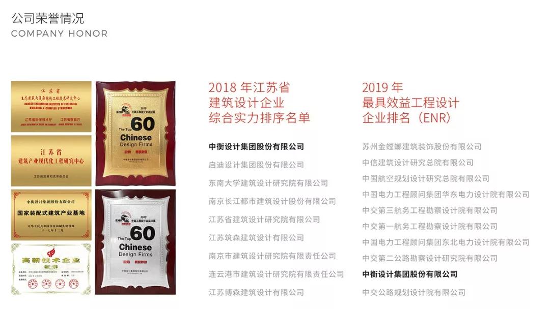 近年來中衡設(shè)計(jì)集團(tuán)綜合實(shí)力不斷增強(qiáng),于2017 年上半年被住建部選定為全國首批 40 家全過程工程咨詢試點(diǎn)企業(yè)之一。目前位列2018江蘇省建筑設(shè)計(jì)企業(yè)綜合實(shí)力第一,連續(xù)兩年入選美國ENR和中國《建筑時(shí)報(bào)》“中國工程設(shè)計(jì)企業(yè)60強(qiáng)”和“最具效益設(shè)計(jì)企業(yè)”榜單。