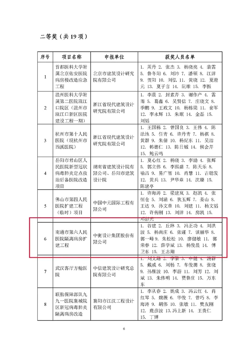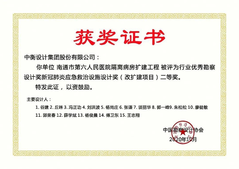 2020年10月,中國(guó)勘察設(shè)計(jì)協(xié)會(huì)行業(yè)優(yōu)秀勘察設(shè)計(jì)獎(jiǎng)新冠肺炎應(yīng)急救治設(shè)施設(shè)計(jì)獎(jiǎng)評(píng)選結(jié)果發(fā)布,武漢火神山醫(yī)院應(yīng)急項(xiàng)目、武漢雷神山醫(yī)院項(xiàng)目等39個(gè)項(xiàng)目獲獎(jiǎng),中衡設(shè)計(jì)集團(tuán)股份有限公司設(shè)計(jì)的南通市第六人民醫(yī)院隔離病房擴(kuò)建工程項(xiàng)目獲二等獎(jiǎng)(改擴(kuò)建項(xiàng)目)。