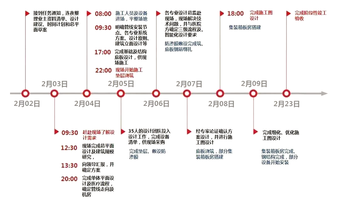 2月4日9:30,各專業(yè)方案溝通會(huì)議,明確管線安裝節(jié)點(diǎn)、各專業(yè)系統(tǒng)方案、設(shè)計(jì)原則、建筑立面設(shè)計(jì)等,全面展開(kāi)設(shè)計(jì)工作;同時(shí)聯(lián)系集裝箱式板房廠家等專項(xiàng)顧問(wèn)公司,協(xié)調(diào)同步開(kāi)展設(shè)計(jì)工作;17:00完成基礎(chǔ)及結(jié)構(gòu)底板設(shè)計(jì),供現(xiàn)場(chǎng)施工;22:00,現(xiàn)場(chǎng)開(kāi)始施工,墊層澆筑。2月5日,設(shè)計(jì)團(tuán)隊(duì)35人投入緊張的設(shè)計(jì)工作,完成設(shè)備清單,供現(xiàn)場(chǎng)采購(gòu)。從2月3日至4日,約36小時(shí)便保證了現(xiàn)場(chǎng)順利開(kāi)工。