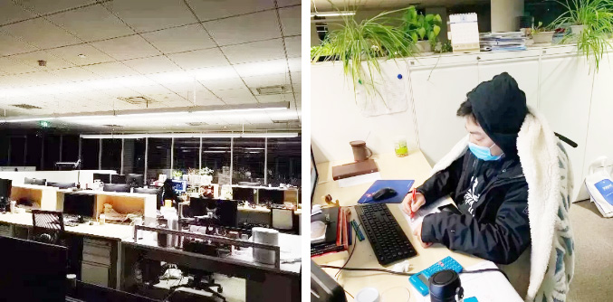 △ 蘇州醫(yī)療設(shè)計(jì)團(tuán)隊(duì)也徹夜奮戰(zhàn)(冷了披上“棉被”)
