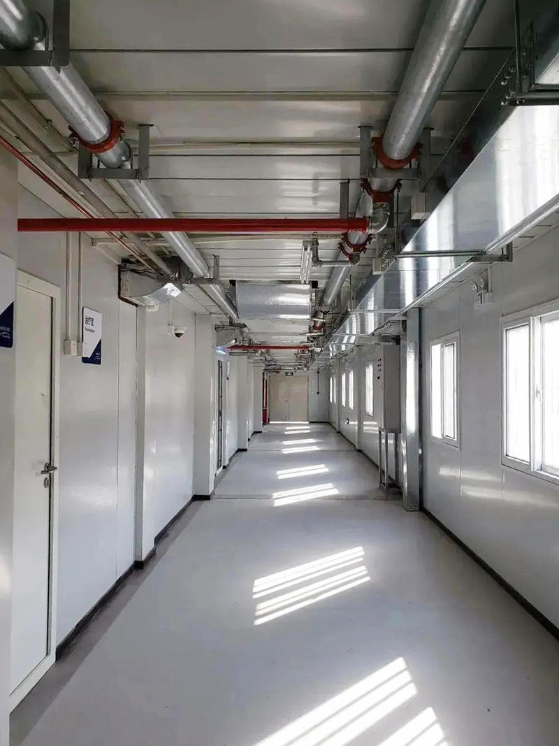 南通第六人民醫(yī)院隔離病房擴(kuò)建工程,與普通應(yīng)急病房擴(kuò)建不同,包含了負(fù)壓病房、ICU、接診區(qū)、影像科、檢驗(yàn)科、預(yù)留手術(shù)區(qū)、醫(yī)用垃圾、醫(yī)用氣體等功能。建筑面積約1.38萬(wàn)平方米,使用集裝箱體869個(gè),混凝土5600立方,建筑鋼筋283噸,鋼結(jié)構(gòu)133噸,病房200床,ICU20床,是一間功能完整的傳染病應(yīng)急醫(yī)院。
