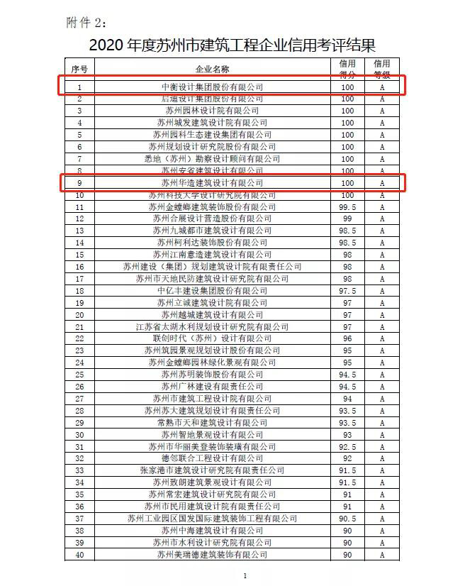近日,蘇州市住房和城鄉(xiāng)建設局2020年度蘇州市工程勘察設計企業(yè)信用考評結果公布,中衡設計集團股份有限公司、中衡設計集團蘇州華造建筑設計有限公司雙雙信用得分100分,信用等級A級。據悉,本次共計38家工程勘察企業(yè)、234家建筑工程企業(yè)和24家市政工程企業(yè)接受綜合評定。經審定和公示,評出工程勘察A類企業(yè)10家、B類企業(yè)27家、C類企業(yè)1家;建筑工程A類企業(yè)40家、B類企業(yè)185家、C類企業(yè)9家;市政工程A類企業(yè)7家、B類企業(yè)17家。