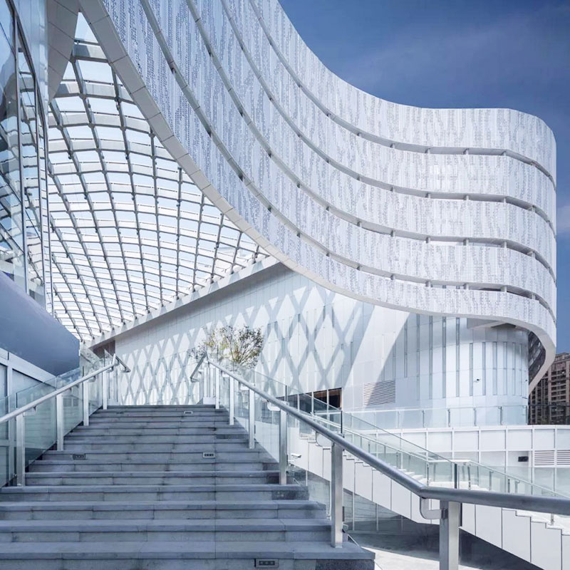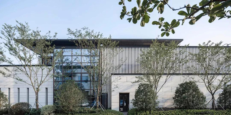 設(shè)計(jì)理念:建筑整體布局源自于一個(gè)十字型的分割,又被兩道微垂的一字型弧面概括。功能上形成四個(gè)方向的限定或者朝向,同時(shí)形體上歸納于兩道孿生的體塊。建筑色彩借鑒徽派建筑粉墻黛瓦的特點(diǎn),以灰黑色金屬勾勒頂部輪廓,以白色石材鋪滿所有墻面。由此建筑寫意留形,像完成一幅幅水墨畫一樣生成建筑的每一個(gè)面相,黑色的線與白色的面理性又浪漫的表達(dá)著立體主義的魅力,以建筑的語(yǔ)言激發(fā)出場(chǎng)所的詩(shī)意。