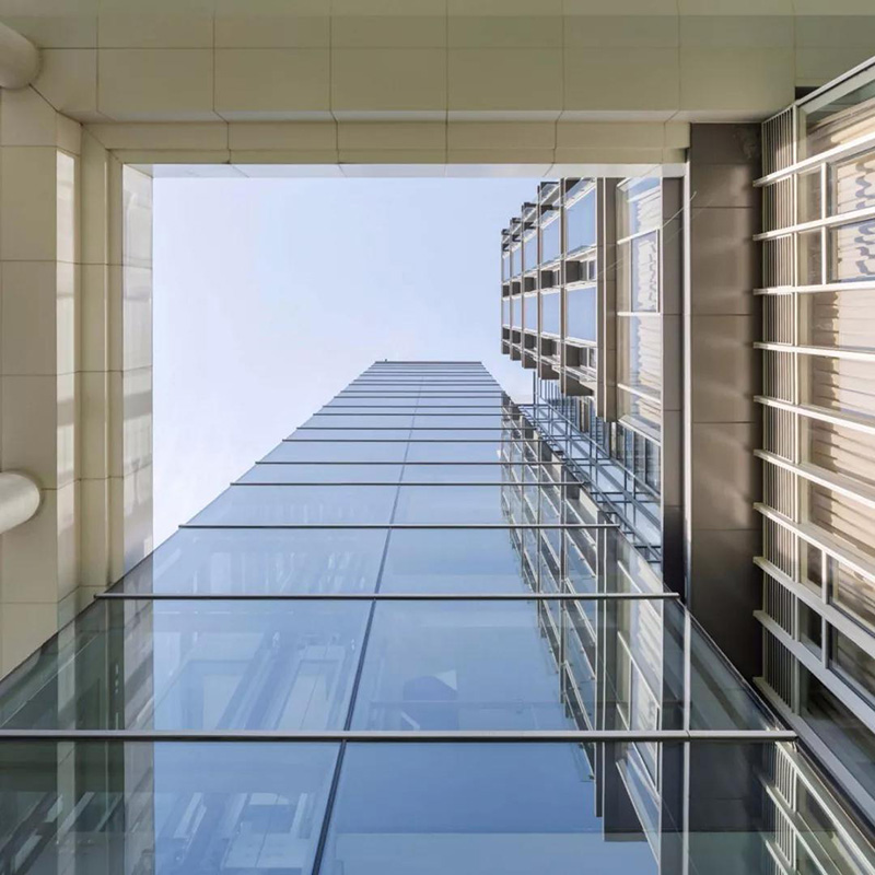在設(shè)計(jì)初期,團(tuán)隊(duì)經(jīng)過(guò)嚴(yán)謹(jǐn)?shù)恼撟C,避免了簡(jiǎn)單地將測(cè)試塔理解為一般(超)高層建筑核心筒的設(shè)計(jì),而是重新考慮平面布局,最終采用規(guī)整的矩形平面,將測(cè)試井道均勻地圍繞在平面四周,形成有利于結(jié)構(gòu)體系設(shè)計(jì)的均衡配置,而且測(cè)試井道所圍合成的內(nèi)部空間在不停站層敲好提供了所設(shè)計(jì)中需要的設(shè)備空間。隨著塔體的升高,在八層、二十六層和三十一層對(duì)塔身進(jìn)行了三次建筑形體縮進(jìn)處理,這樣一方面是出于對(duì)抵抗風(fēng)荷載方面的積極回應(yīng),另一方面也是豐富的建筑形態(tài)的處理手法。最后分別在二十六層和三十一層布置兩處可供參觀、游覽的觀光平臺(tái),觀光平臺(tái)以半圓形體量嵌于塔身之上,平臺(tái)向外懸挑達(dá)8m,探向空中,可俯瞰整個(gè)區(qū)域。一條觀光測(cè)試梯所需要的玻璃體量由塔底向上至塔頂,貫穿整個(gè)塔身,提亮了整個(gè)測(cè)試塔。