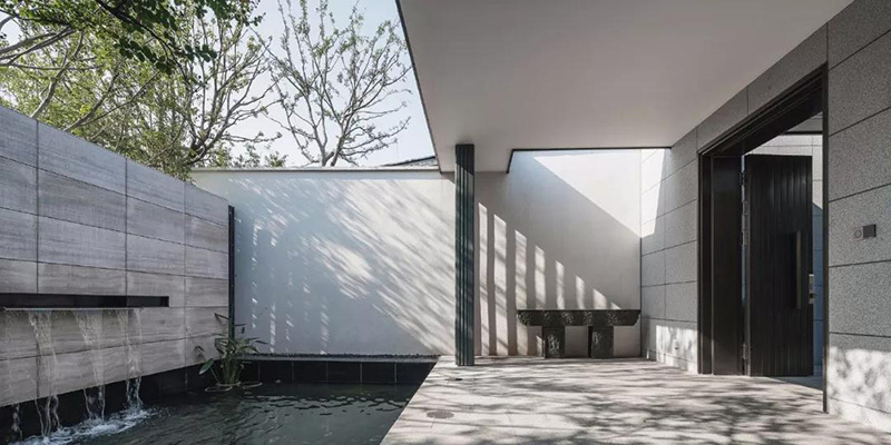 外部形象樸拙,有被自然風(fēng)雨侵蝕的孔洞效果,剁斧混凝土與清水混凝土交接使用,猶如破土而出的太湖石。溪院以簡(jiǎn)潔的硬質(zhì)鋪裝為主,曲水流觴蜿蜒穿梭在疏影婆娑樹林當(dāng)中,泉水汩汩聲縈繞在其中,這些都營(yíng)造出場(chǎng)地的靜謐氛圍;水院以水為主,靜謐的水面和建筑交相輝映。