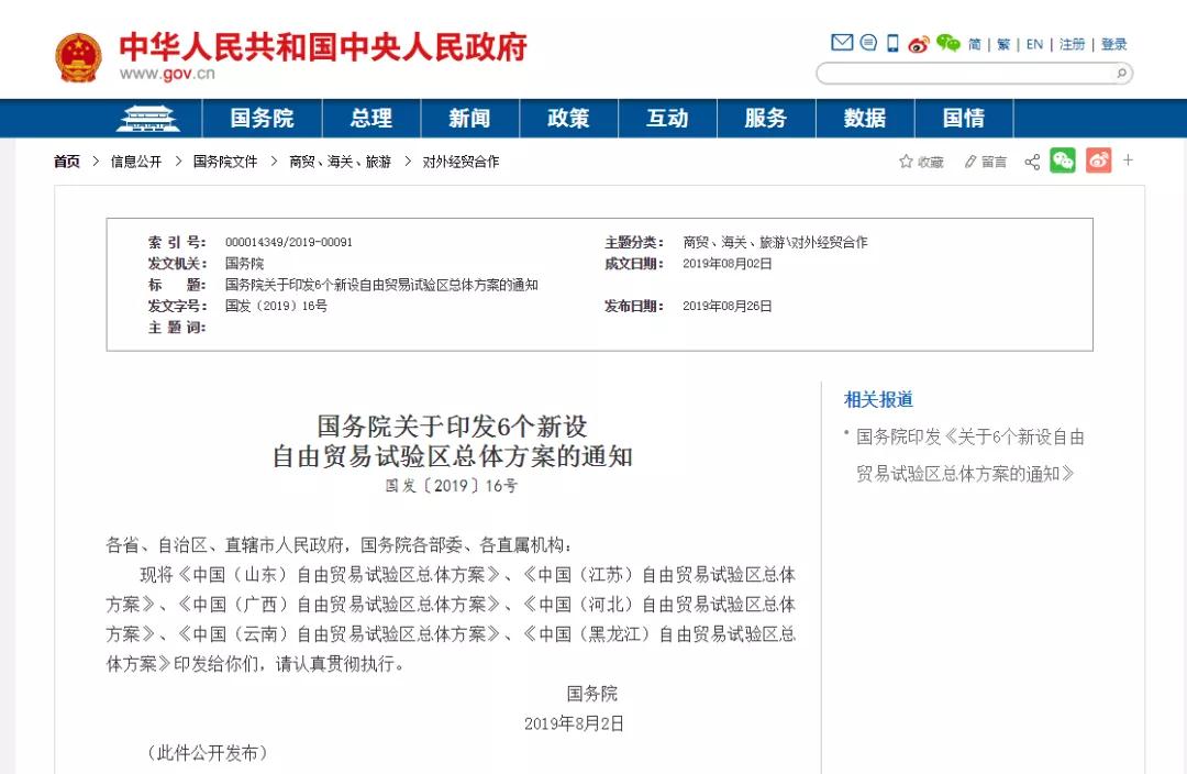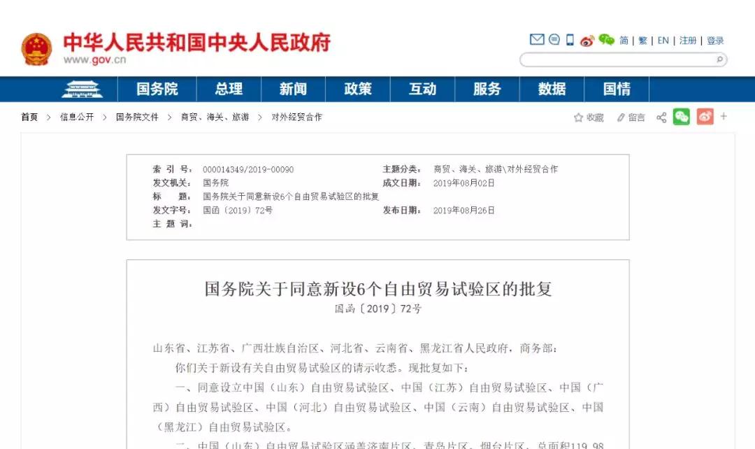 8月26日,中國(guó)政府網(wǎng)發(fā)文,國(guó)務(wù)院同意設(shè)立中國(guó)(山東)自由貿(mào)易試驗(yàn)區(qū)、中國(guó)(江蘇)自由貿(mào)易試驗(yàn)區(qū)、中國(guó)(廣西)自由貿(mào)易試驗(yàn)區(qū)、中國(guó)(河北)自由貿(mào)易試驗(yàn)區(qū)、中國(guó)(云南)自由貿(mào)易試驗(yàn)區(qū)、中國(guó)(黑龍江)自由貿(mào)易試驗(yàn)區(qū)等6個(gè)自由貿(mào)易試驗(yàn)區(qū),同時(shí)發(fā)布了《中國(guó)(山東)自由貿(mào)易試驗(yàn)區(qū)總體方案》、《中國(guó)(江蘇)自由貿(mào)易試驗(yàn)區(qū)總體方案》、《中國(guó)(廣西)自由貿(mào)易試驗(yàn)區(qū)總體方案》、《中國(guó)(河北)自由貿(mào)易試驗(yàn)區(qū)總體方案》、《中國(guó)(云南)自由貿(mào)易試驗(yàn)區(qū)總體方案》、《中國(guó)(黑龍江)自由貿(mào)易試驗(yàn)區(qū)總體方案》等6個(gè)新設(shè)自由貿(mào)易試驗(yàn)區(qū)的方案。標(biāo)志著江蘇自貿(mào)區(qū)建設(shè)啟幕。