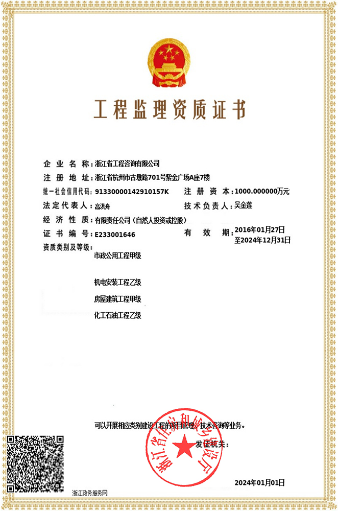 工程監(jiān)理資質(zhì)證書(房屋建筑工程甲級(jí)、市政公用工程甲級(jí)、機(jī)電安裝工程乙級(jí)、化工石油工程監(jiān)理乙級(jí))